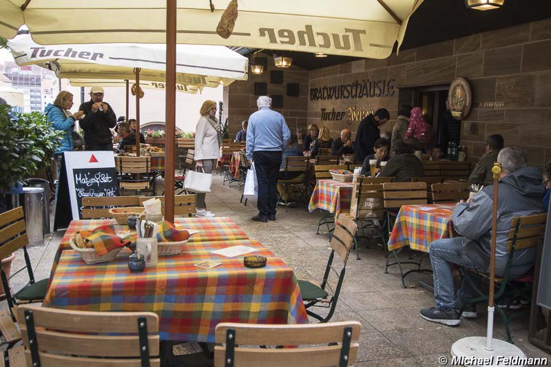 Das auf dem Foto zu sehende Bratwursthäusle befindet sich in unmittelbarer Nachbarschaft zum Nürnberger Hauptmarkt. Hier haben Besucher die Möglichkeit, eine weltweit bekannte kulinarische Köstlichkeit zu genießen, die Nürnberger Bratwurst. Ihre Geschichte reicht bis ins Mittelalter zurück. Schon damals wurde sie nach dem heutigen Rezept hergestellt, auch gab es eine exakte Festlegung ihrer Größe. Die bis heute gleich gebliebene Qualität ließ bereits im Jahr 1313 der Nürnberger Rat von einer sogenannten Lebensmittelpolizei kontrollieren. Auch Goethe war von der Bratwurst so angetan, dass er sie sich nach Weimar schicken ließ.