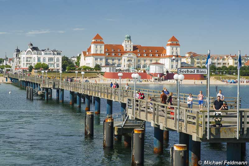 Diese Aufnahme zeigt die Seebrücke des Ostseebades Binz mit einem Teil des Strandes sowie dem bekannten Kurhaus. Der Ort ist ein beliebtes Urlaubsziel, der jährlich eine Vielzahl an Touristen anzieht. Binz gilt als das größte Seebad auf der Ferieninsel Rügen. Die Gemeinde befindet sich an der dortigen Ostküste zwischen dem Schmachter See und der Bucht Prorer Wiek. Sie zeichnet sich vor allem durch ihre prachtvolle Bäderarchitektur, den feinen weißen Sandstrand, das Jagdschloss Granitz, das gigantische Bauwerk von Prora sowie die umliegende Naturlandschaft aus. Letztere wird auch im vielbesuchten Naturerbe-Zentrum Rügen präsentiert.