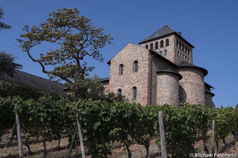 Auf der Aufnahme ist die bei Geisenheim gelegene Basilika Johannisberg zu sehen. Bei dem ursprünglichen Gebäude handelte es sich um eine um 1130 errichtete Pfeilerbasilika mit einem Querschiff und drei Apsiden, die Teil des früheren Benediktinerklosters vor Ort war. Geweiht wurde sie auf das Patronat des Heiligen Johannes des Täufers, das bis heute dem Gotteshaus ihren Namen gibt. Im 15. Jahrhundert erhielt der Vierungsturm einen spitzen Helmaufsatz. Die Abtragung des Weststurms fand im Jahr 1718 statt. Zu dieser Zeit nahm man auch eine Verkürzung des Langhauses der Kirche vor. Im 18. Jahrhundert wurden die Klausurgebäude des zugehörigen Klosters abgetragen, des Weiteren erfolgte eine Barockisierung des Gotteshauses. Im Zuge dessen erhielt dieses einen Dachreiter auf der Vierung. Nicht lange danach fand unter Staatskanzler Metternich ein Umbau im klassizistischen Stil statt.